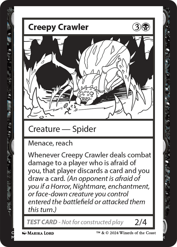 Whenever Creepy Crawler deals combat damage to a player who is afraid of you, that player discards a card and you draw a card. (An opponent is afraid of you if a Horror, Nightmare, enchantment, or face-down creature you control entered the b