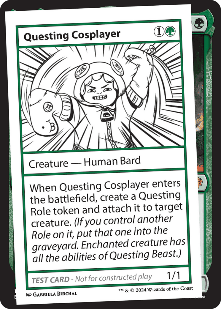 When Questing Cosplayer enters the battlefield, create a Questing Role token and attach it to target creature. (If you control another Role on it, put that one into the graveyard. Enchanted creature has all the abilities of Questing Beast.)