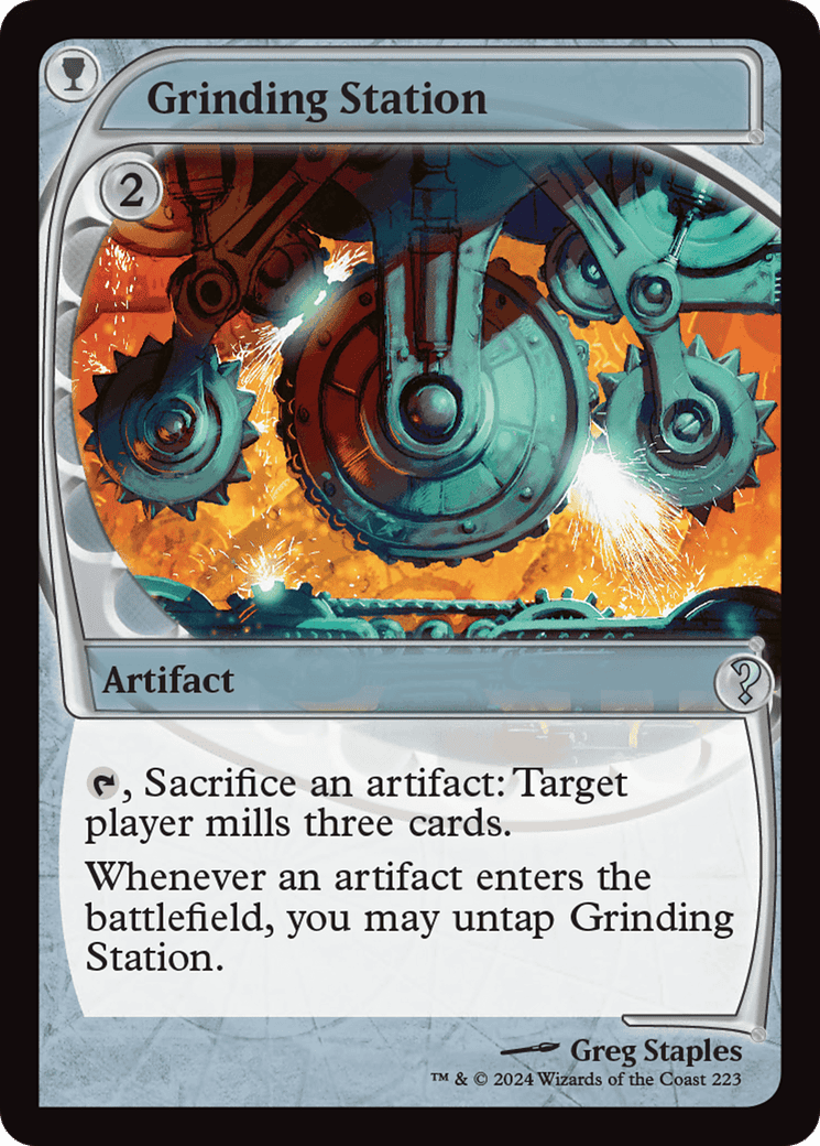 {T}, Sacrifice an artifact: Target player mills three cards. Whenever an artifact enters, you may untap this artifact.