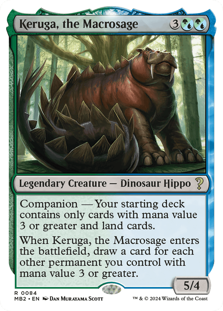 Companion – Your starting deck contains only cards with mana value 3 or greater and land cards. (If this card is your chosen companion, you may put it into your hand from outside the game for {3} as a sorcery.)