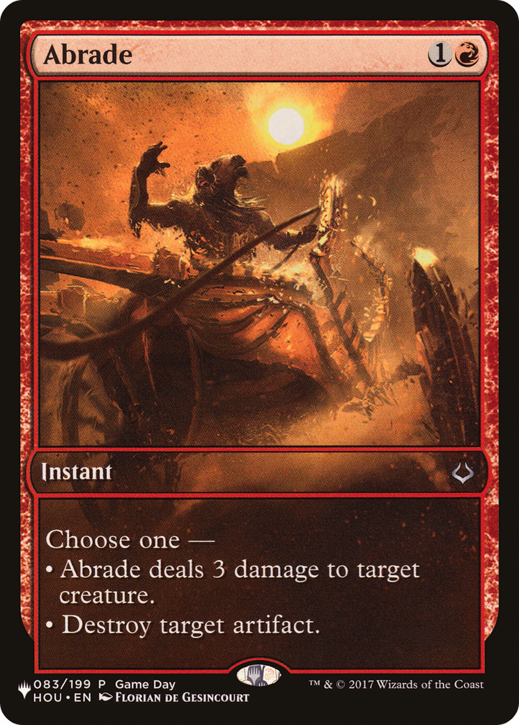 Choose one – – Abrade deals 3 damage to target creature. – Destroy target artifact.