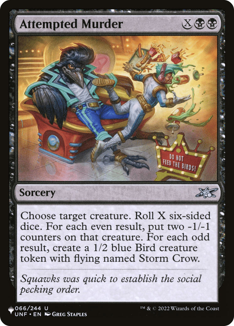 Choose target creature. Roll X six-sided dice. For each even result, put two -1/-1 counters on that creature. For each odd result, create a 1/2 blue Bird creature token with flying named Storm Crow.