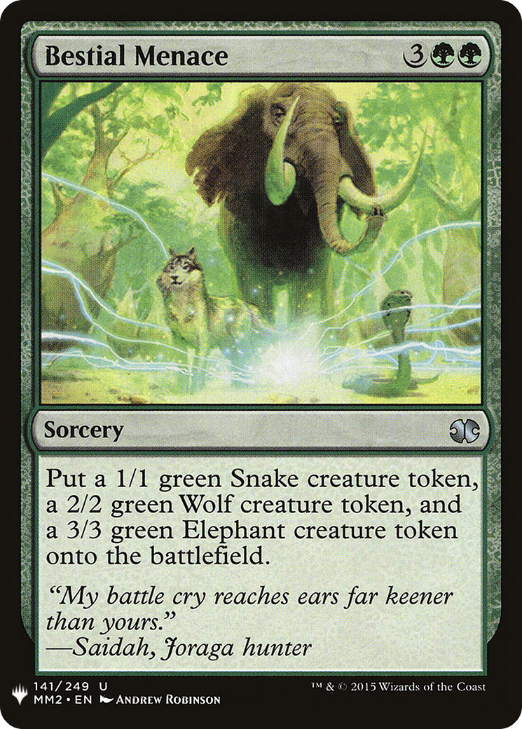 Create a 1/1 green Snake creature token, a 2/2 green Wolf creature token, and a 3/3 green Elephant creature token.