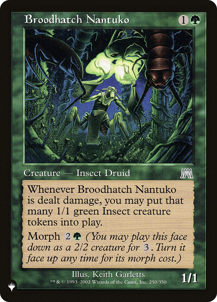 Whenever this creature is dealt damage, you may create that many 1/1 green Insect creature tokens.