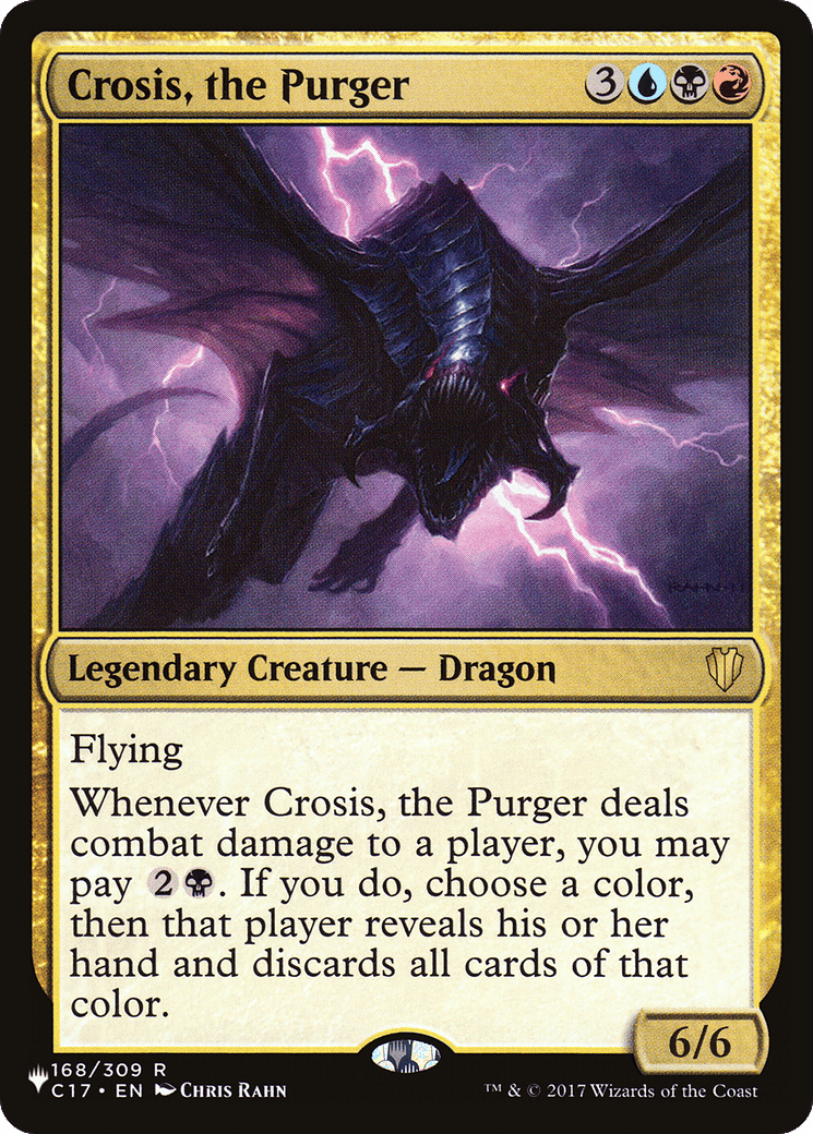 Whenever Crosis deals combat damage to a player, you may pay {2}{B}. If you do, choose a color, then that player reveals their hand and discards all cards of that color.