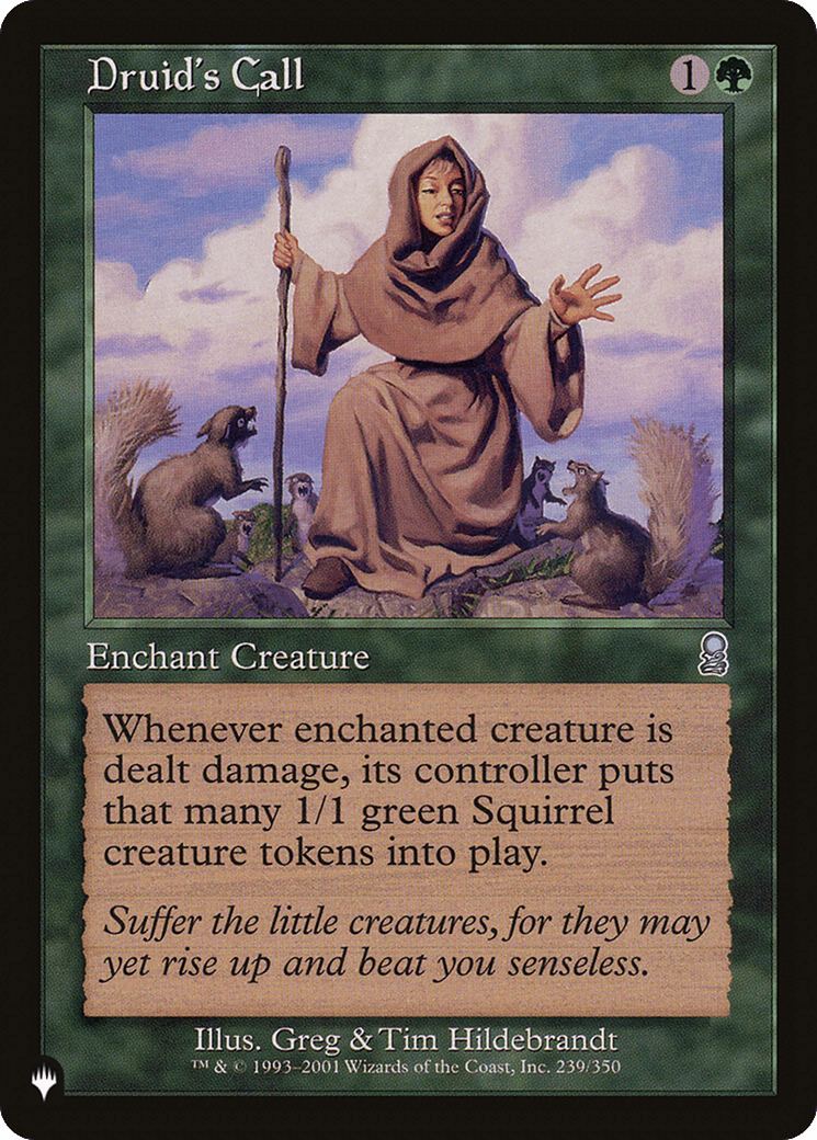 Whenever enchanted creature is dealt damage, its controller creates that many 1/1 green Squirrel creature tokens.