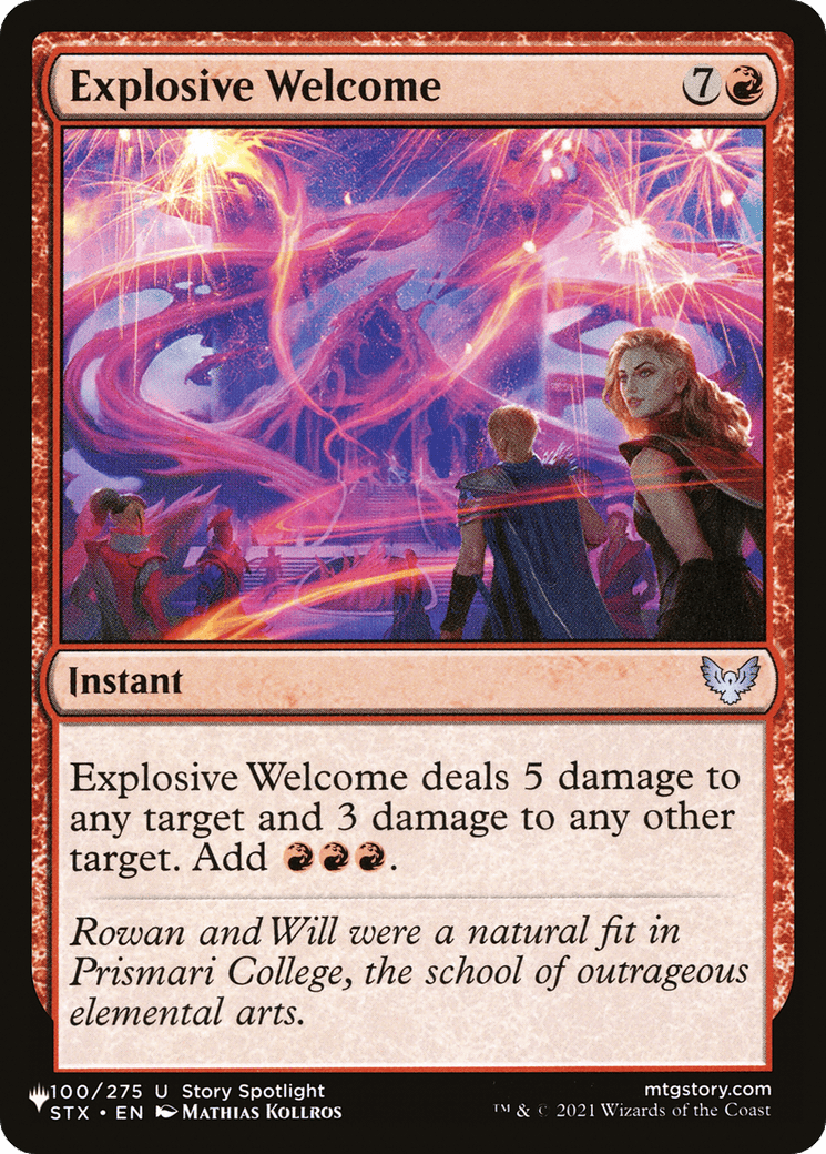 Explosive Welcome deals 5 damage to any target and 3 damage to any other target. Add {R}{R}{R}.