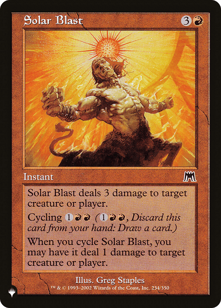 Solar Blast deals 3 damage to any target. Cycling {1}{R}{R} ({1}{R}{R}, Discard this card: Draw a card.) When you cycle this card, you may have it deal 1 damage to any target.