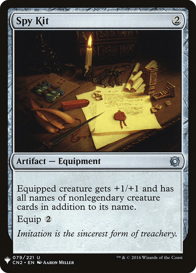 Equipped creature gets +1/+1 and has all names of nonlegendary creature cards in addition to its name.