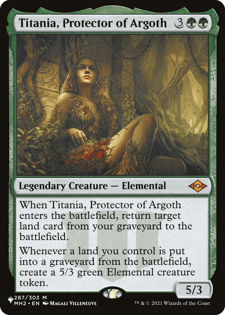 When Titania enters, return target land card from your graveyard to the battlefield.