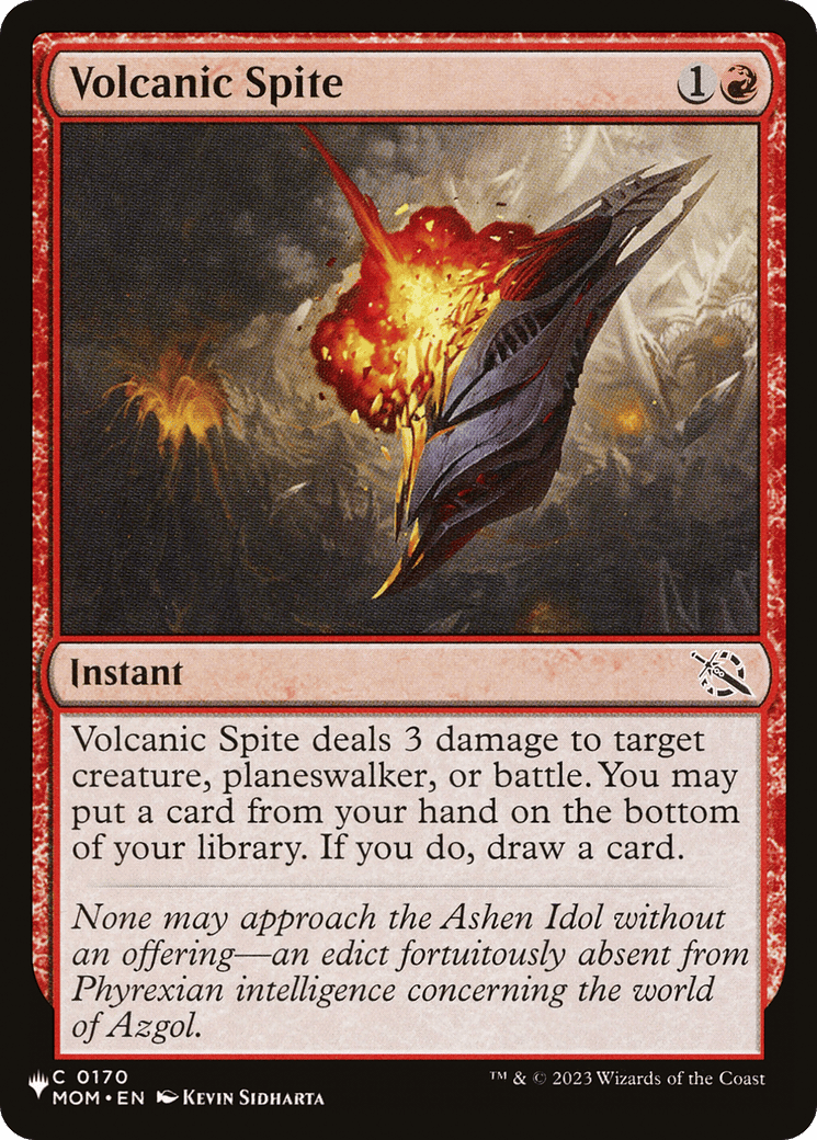 Volcanic Spite deals 3 damage to target creature, planeswalker, or battle. You may put a card from your hand on the bottom of your library. If you do, draw a card.
