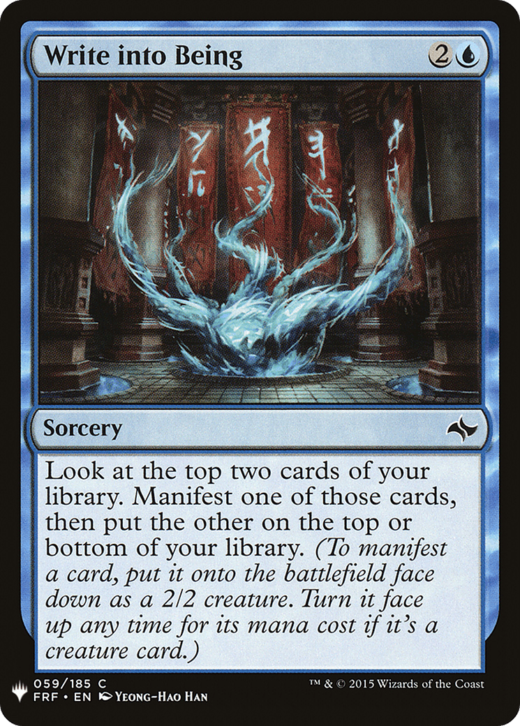 Look at the top two cards of your library. Manifest one of those cards, then put the other on the top or bottom of your library. (To manifest a card, put it onto the battlefield face down as a 2/2 creature. Turn it face up any time for its mana cost if it