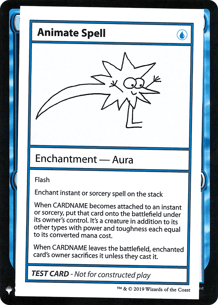 When Animate Spell becomes attached to an instant or sorcery, put that card onto the battlefield under its owner’s control. It’s a creature in addition to its other types with power and toughness each eq