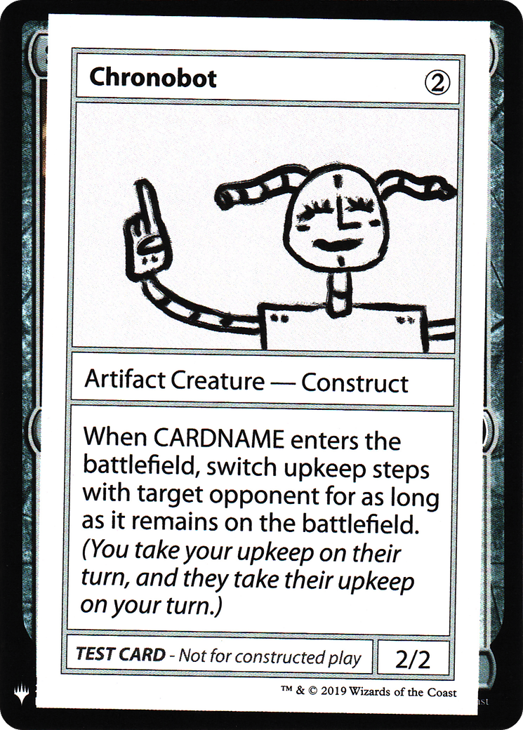 When Chronobot enters, switch upkeep steps with target opponent for as long as it remains on the battlefield. (You take your upkeep on their turn, and they take their upkeep on your turn.)