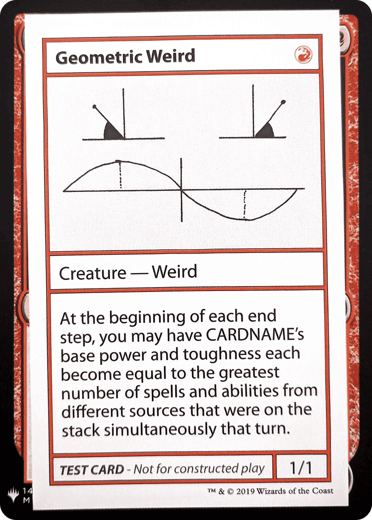 At the beginning of each end step, you may have Geometric Weird’s base power and toughness each become equal to the greatest number of spells and abilities from different sources that were on the stack simultaneously that turn.