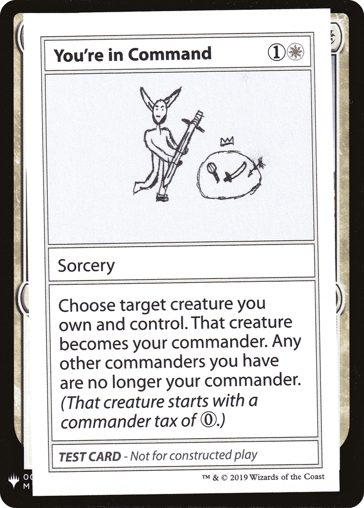 Choose target creature you own and control. That creature becomes your commander. Any other commanders you have are no longer your commander. (That creature starts with a commander tax of {0}.)
