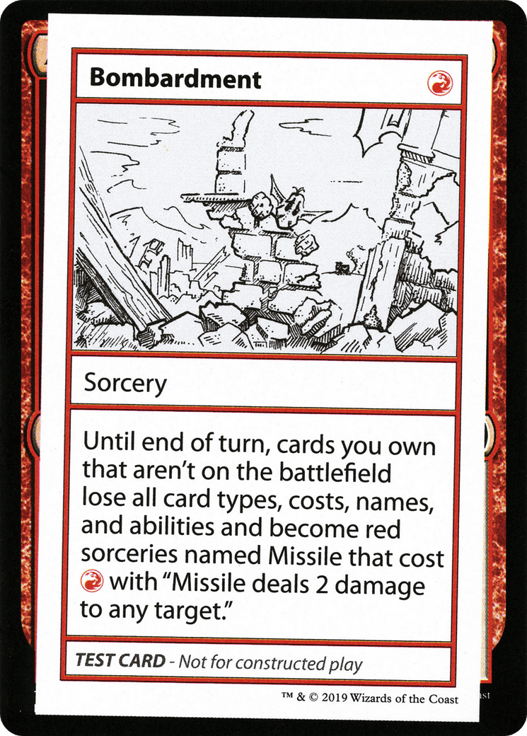 Until end of turn, cards you own that aren’t on the battlefield lose all card types, costs, names, and abilities and become red sorceries named Missile that cost {R} with “Missile deals 2 damage to any target.”