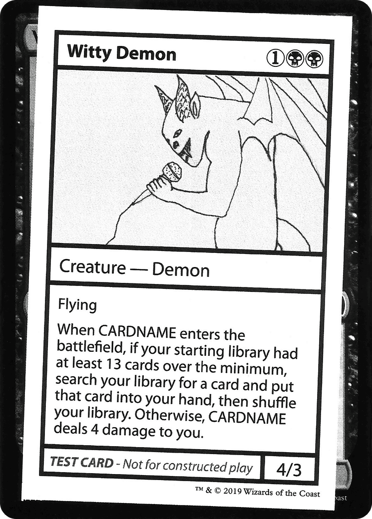 When Witty Demon enters, if your starting library had at least 13 cards over the minimum, search your library for a card and put that card into your hand, then shuffle your library. Otherwise, Witty Demon deals 4 damage to you.