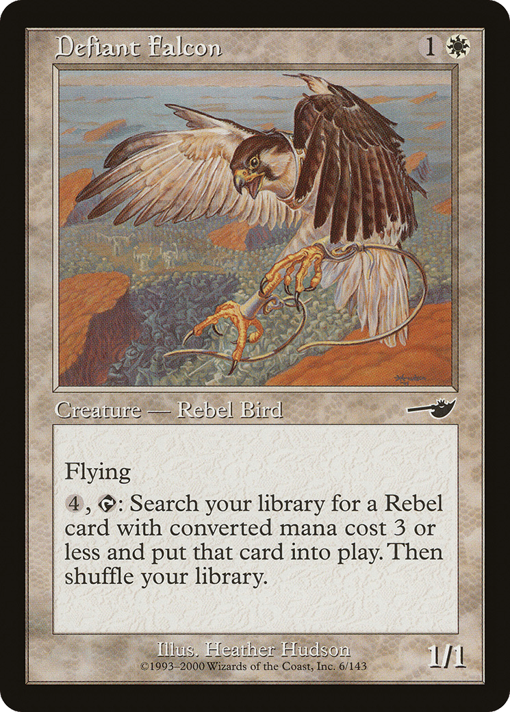 Flying {4}, {T}: Search your library for a Rebel permanent card with mana value 3 or less, put it onto the battlefield, then shuffle.
