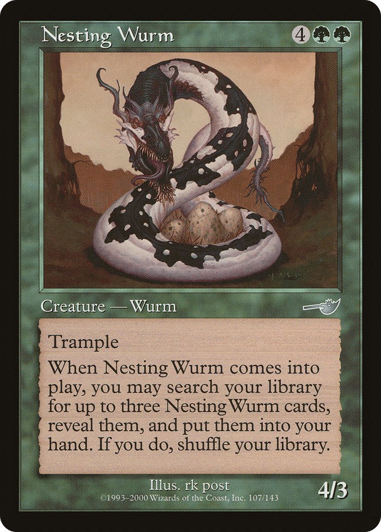Trample When this creature enters, you may search your library for up to three cards named Nesting Wurm, reveal them, put them into your hand, then shuffle.