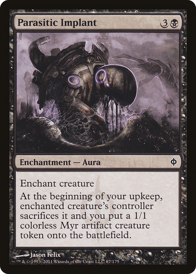 Enchant creature At the beginning of your upkeep, enchanted creature’s controller sacrifices it and you create a 1/1 colorless Phyrexian Myr artifact creature token.