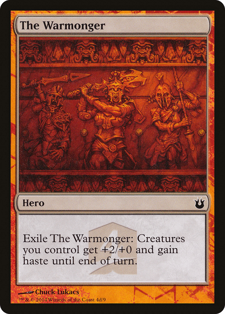 Exile The Warmonger: Creatures you control get +2/+0 and gain haste until end of turn.