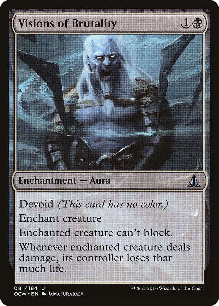 Devoid (This card has no color.) Enchant creature Enchanted creature can’t block. Whenever enchanted creature deals damage, its controller loses that much life.