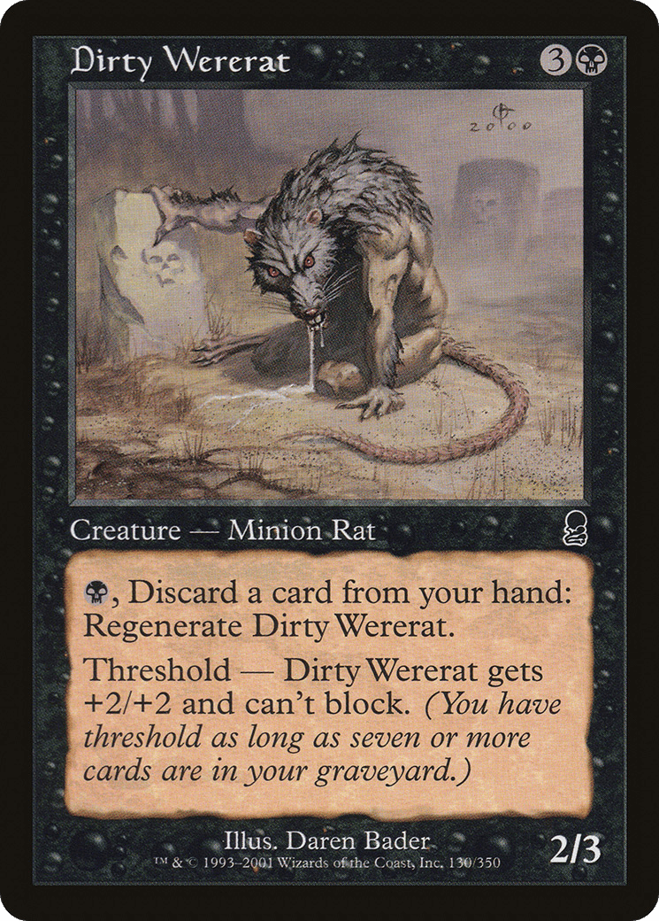 {B}, Discard a card: Regenerate this creature. Threshold – As long as seven or more cards are in your graveyard, this creature gets +2/+2 and can’t block.