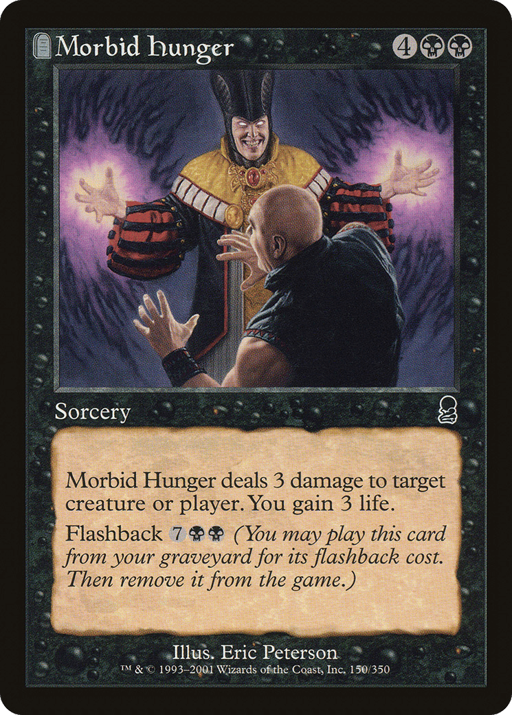 Morbid Hunger deals 3 damage to any target. You gain 3 life. Flashback {7}{B}{B} (You may cast this card from your graveyard for its flashback cost. Then exile it.)