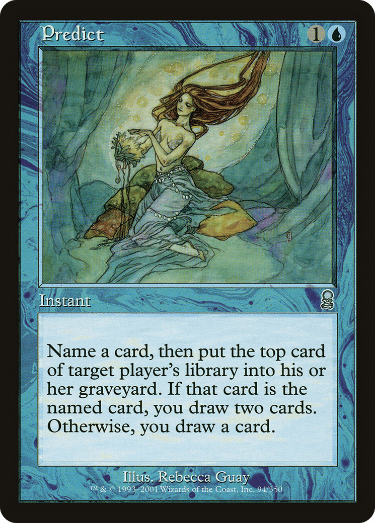 Choose a card name, then target player mills a card. If a card with the chosen name was milled this way, you draw two cards. Otherwise, you draw a card.