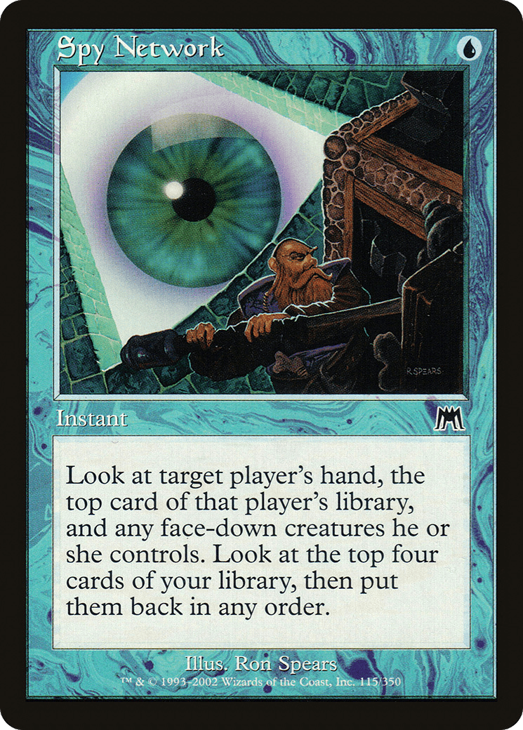 Look at target player’s hand, the top card of that player’s library, and any face-down creatures they control. Look at the top four cards of your library, then put them back in any order.