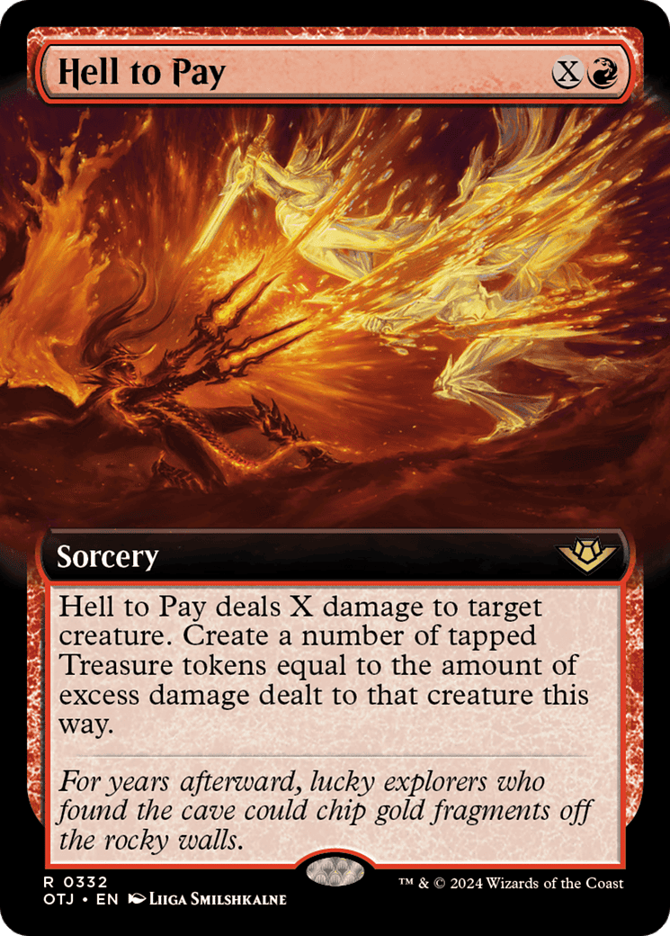 Hell to Pay deals X damage to target creature. Create a number of tapped Treasure tokens equal to the amount of excess damage dealt to that creature this way.