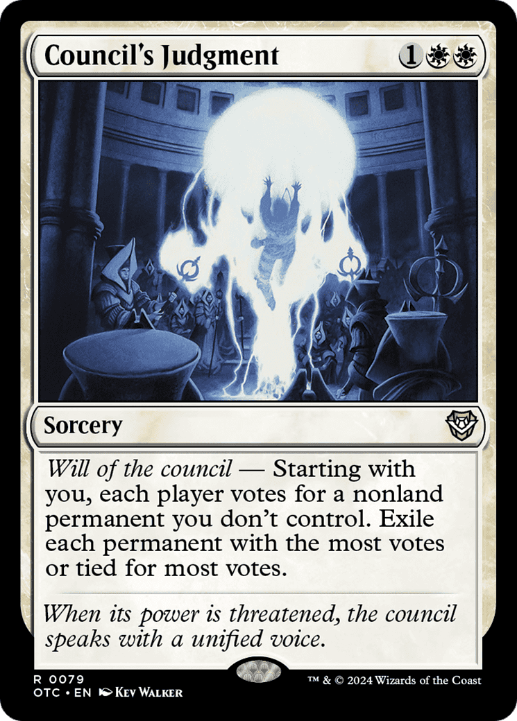 Will of the council – Starting with you, each player votes for a nonland permanent you don’t control. Exile each permanent with the most votes or tied for most votes.