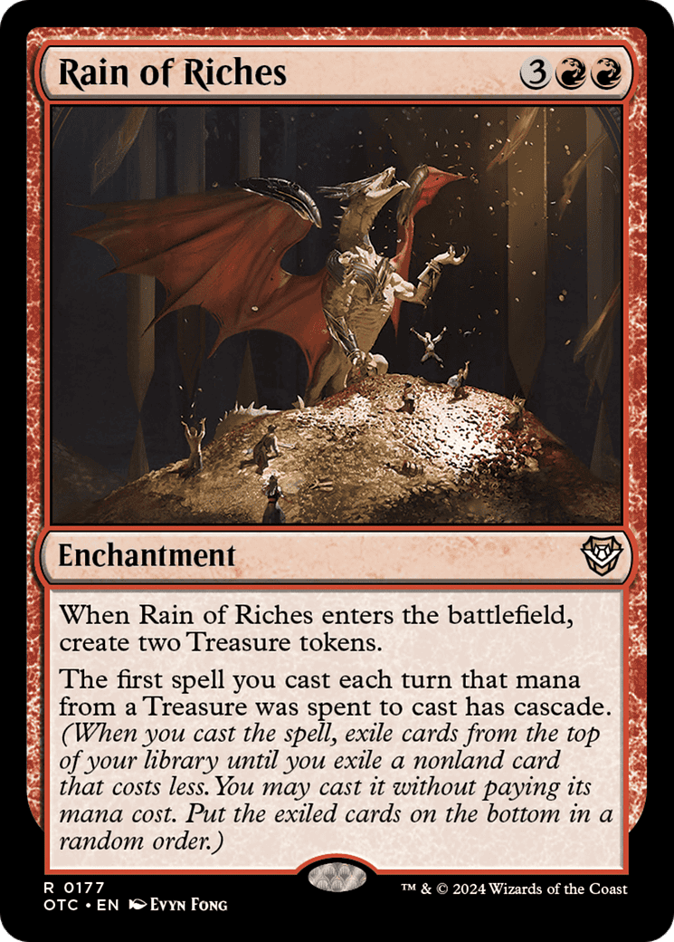The first spell you cast each turn that mana from a Treasure was spent to cast has cascade. (When you cast the spell, exile cards from the top of your library until you exile a nonland card that co
