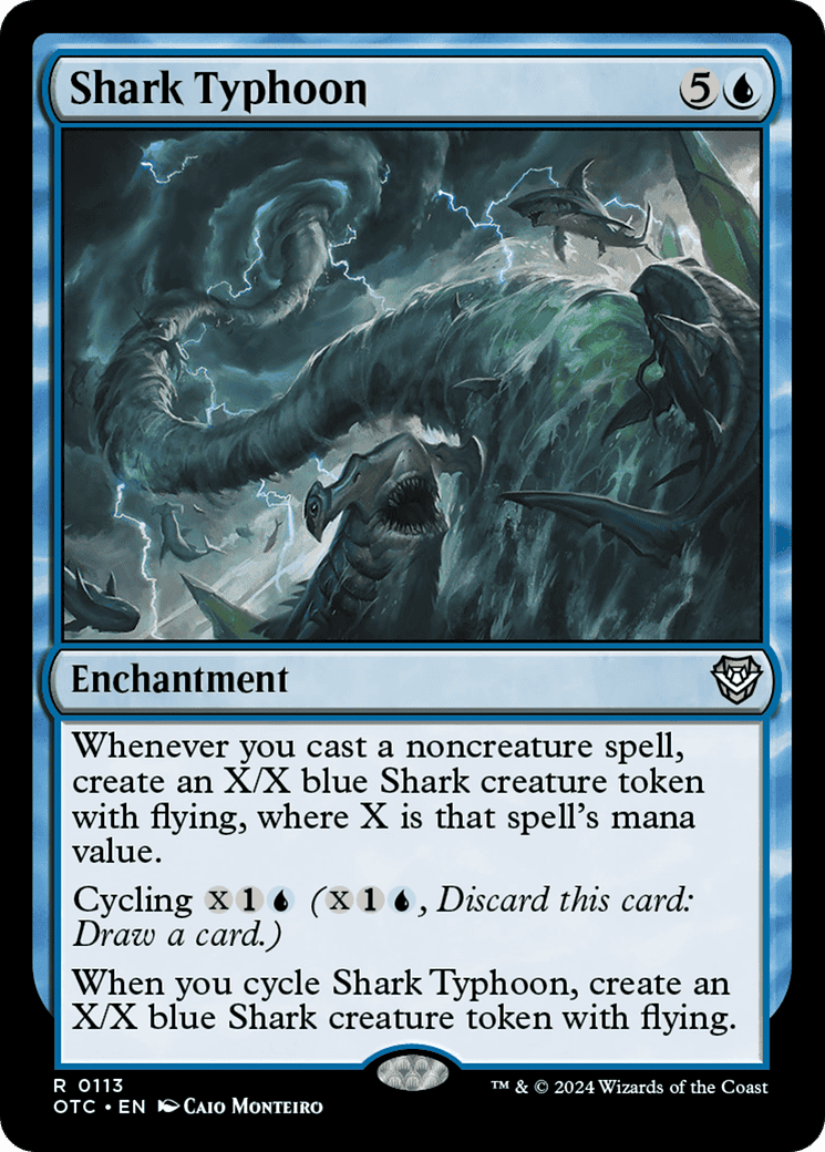 Whenever you cast a noncreature spell, create an X/X blue Shark creature token with flying, where X is that spell’s mana value.