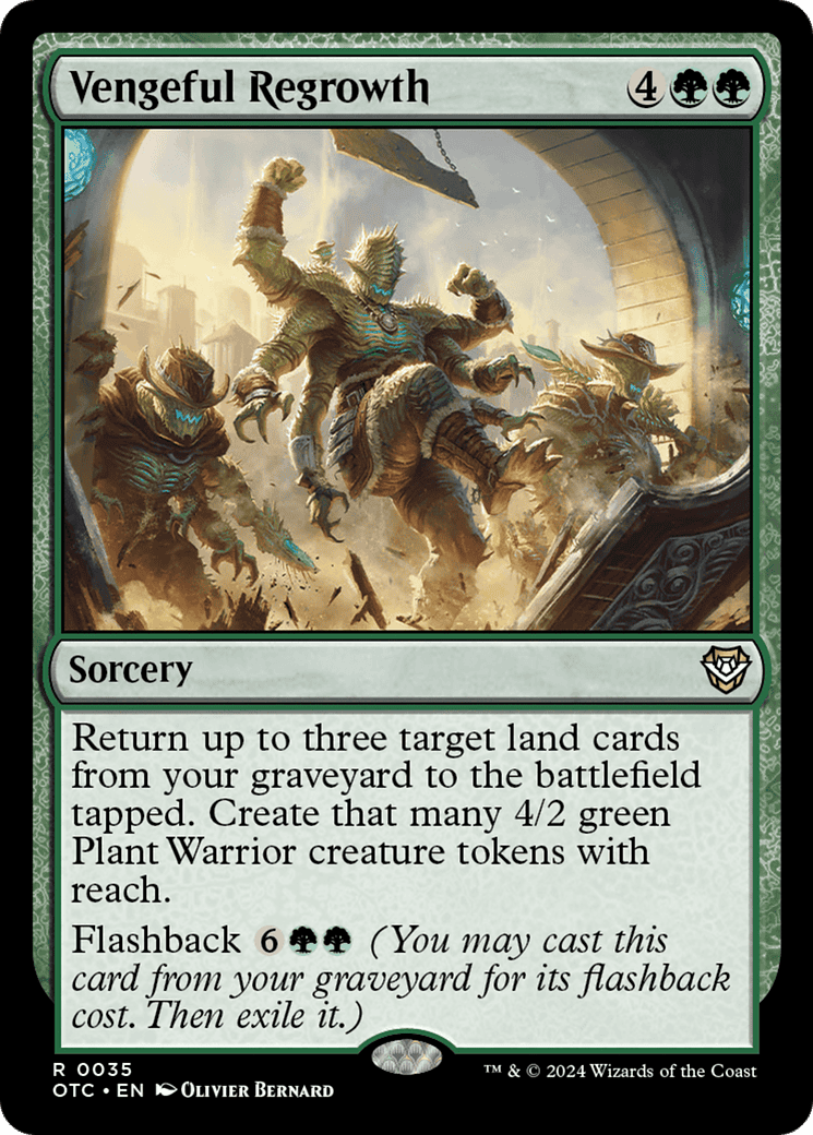 Return up to three target land cards from your graveyard to the battlefield tapped. Create that many 4/2 green Plant Warrior creature tokens with reach.