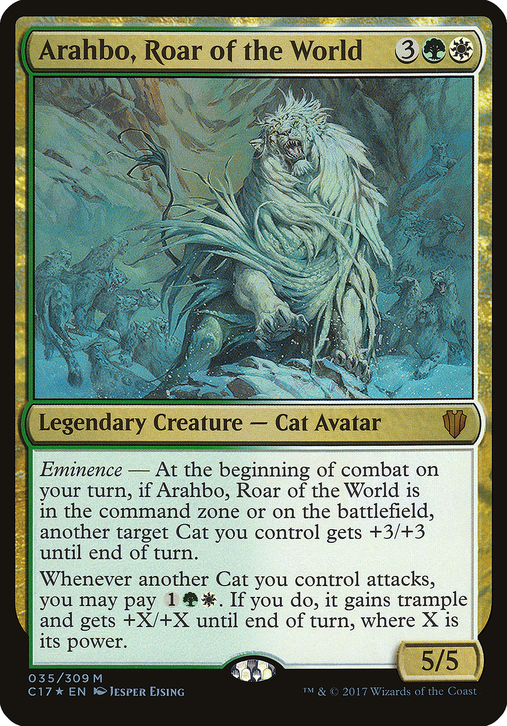 Eminence – At the beginning of combat on your turn, if Arahbo is in the command zone or on the battlefield, another target Cat you control gets +3/+3 until end of turn.