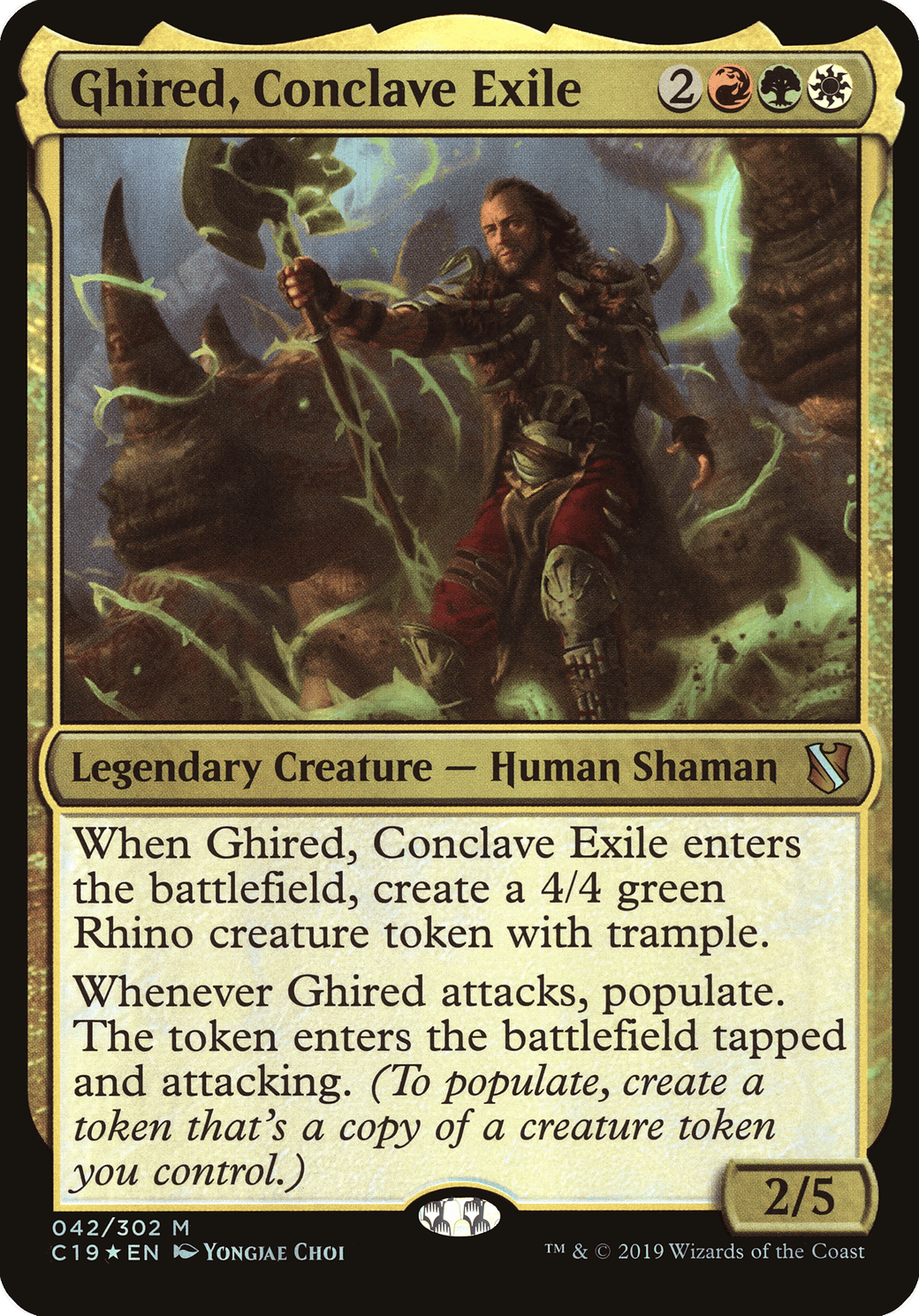 When Ghired enters, create a 4/4 green Rhino creature token with trample.