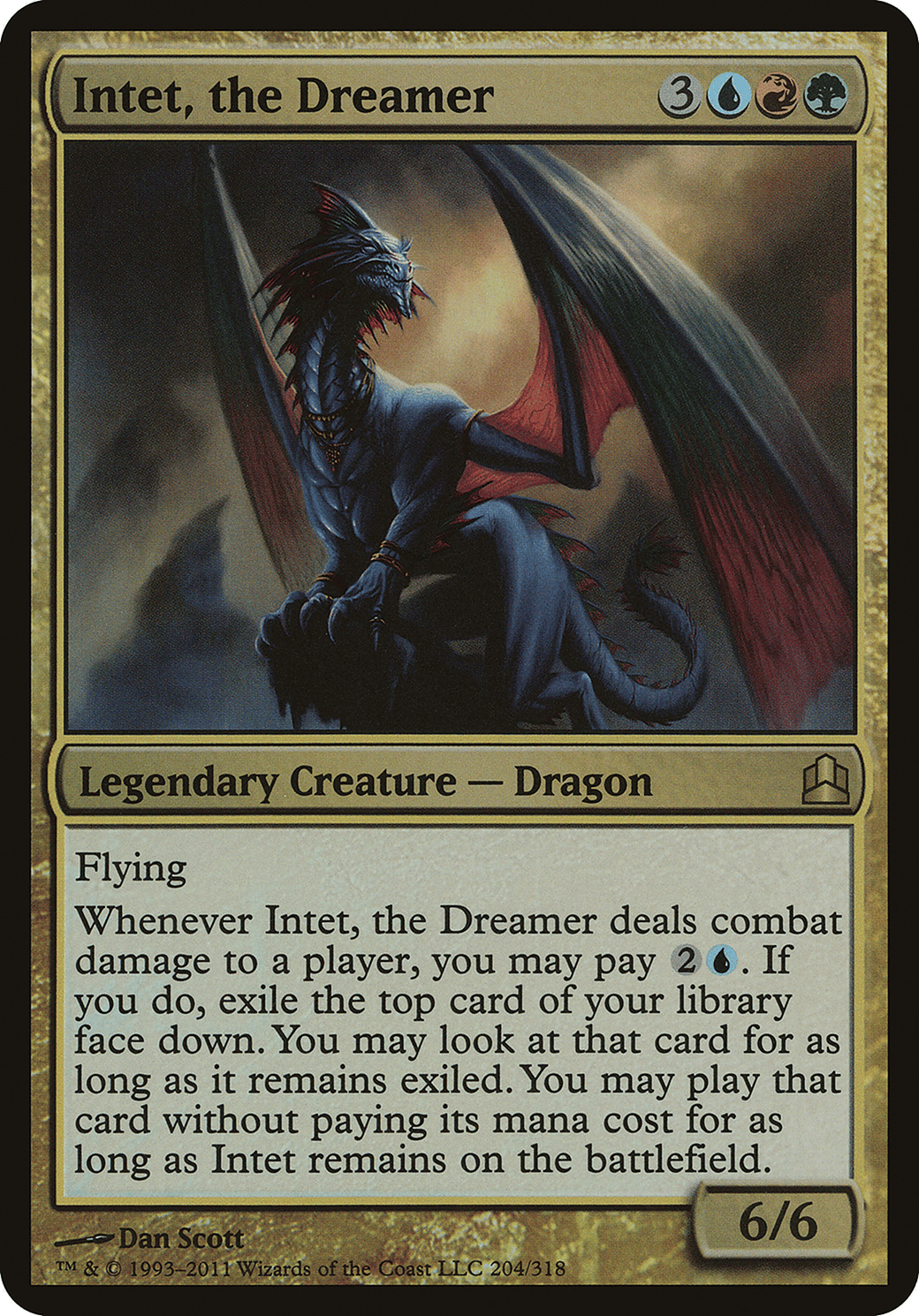 Whenever Intet deals combat damage to a player, you may pay {2}{U}. If you do, exile the top card of your library face down. You may look at that card for as long as it remains exiled. You may play that card without paying its mana cost for as long