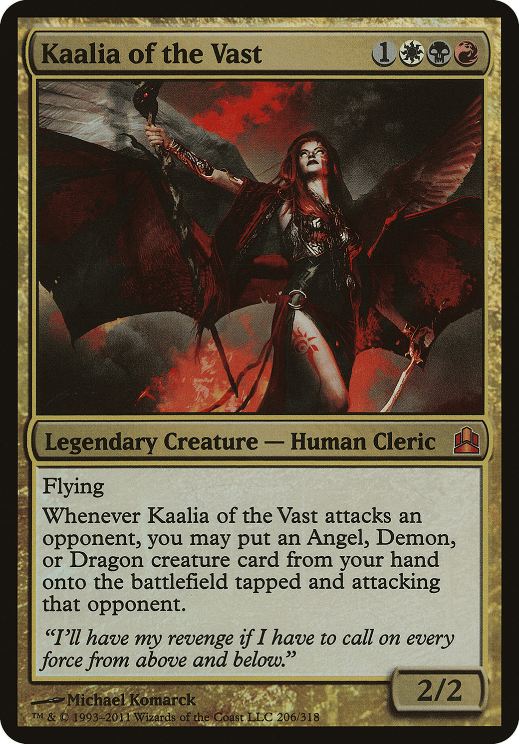 Whenever Kaalia attacks an opponent, you may put an Angel, Demon, or Dragon creature card from your hand onto the battlefield tapped and attacking that opponent.