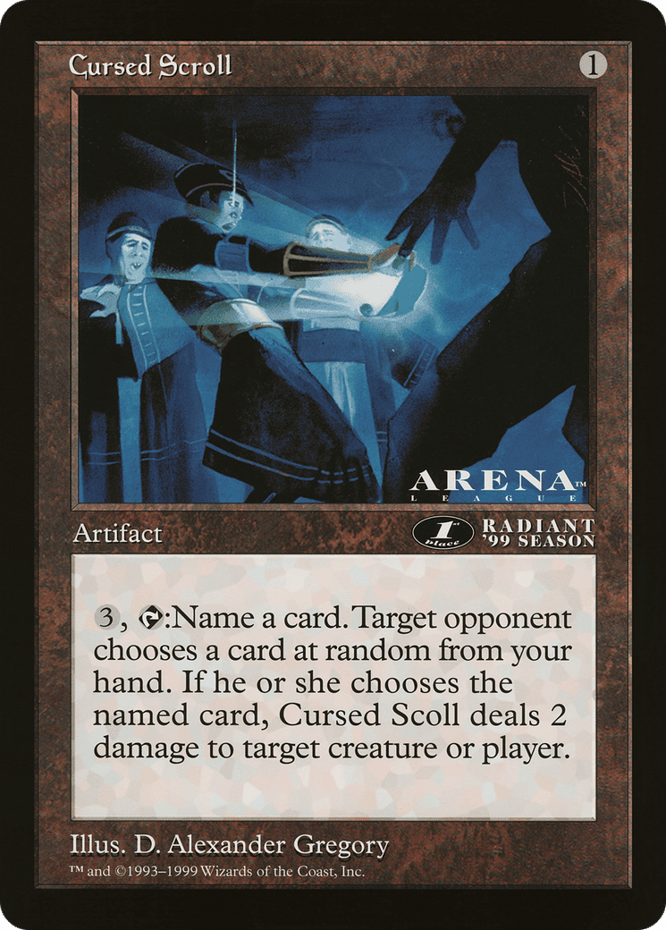 {3}, {T}: Choose a card name, then reveal a card at random from your hand. If that card has the chosen name, Cursed Scroll deals 2 damage to any target.