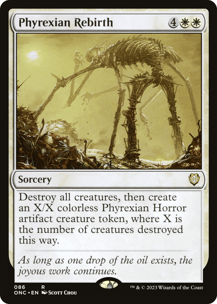 Destroy all creatures, then create an X/X colorless Phyrexian Horror artifact creature token, where X is the number of creatures destroyed this way.