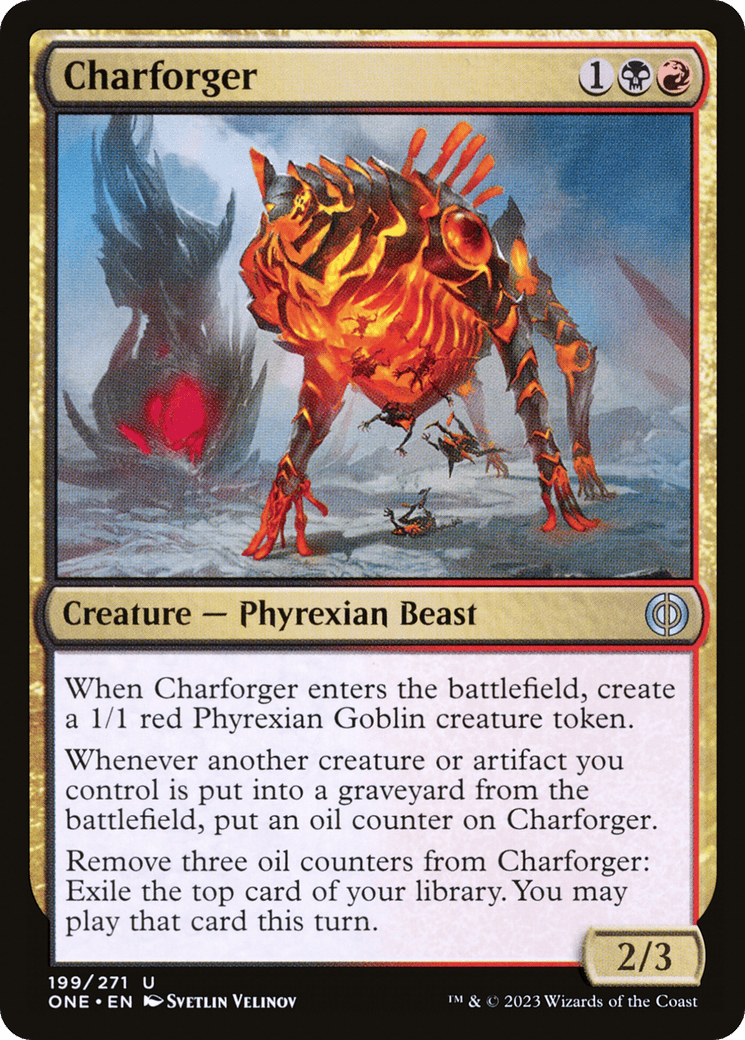 When this creature enters, create a 1/1 red Phyrexian Goblin creature token.