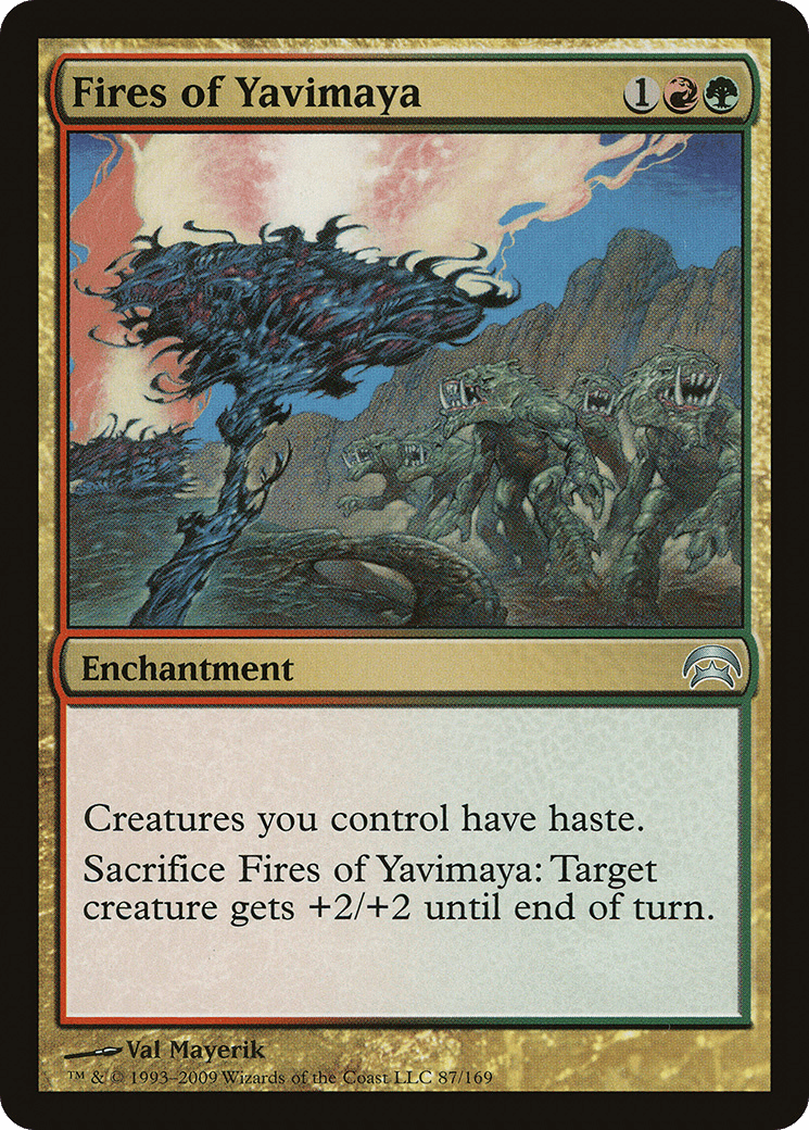 Creatures you control have haste. Sacrifice this enchantment: Target creature gets +2/+2 until end of turn.