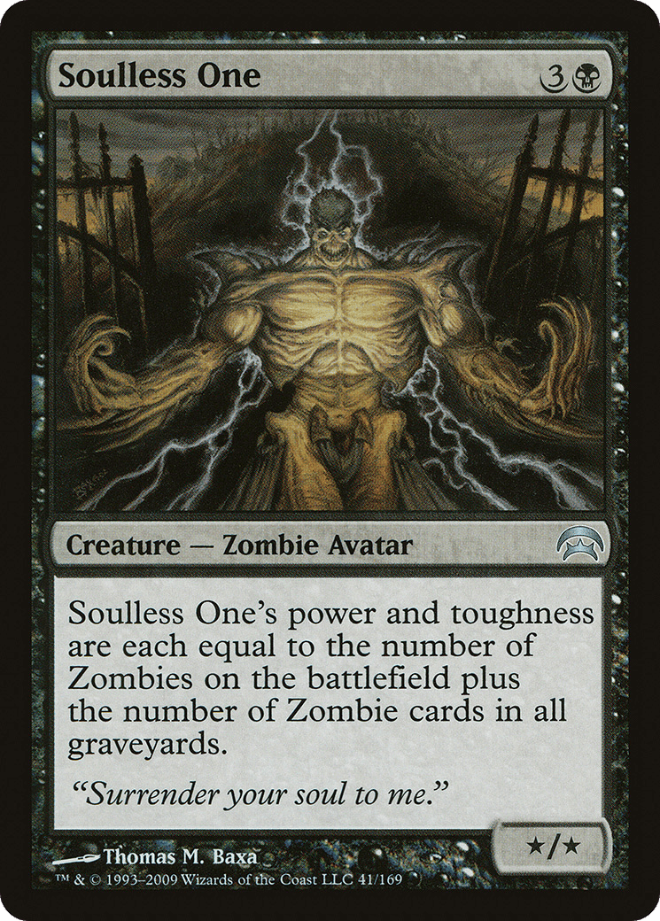Soulless One’s power and toughness are each equal to the number of Zombies on the battlefield plus the number of Zombie cards in all graveyards.
