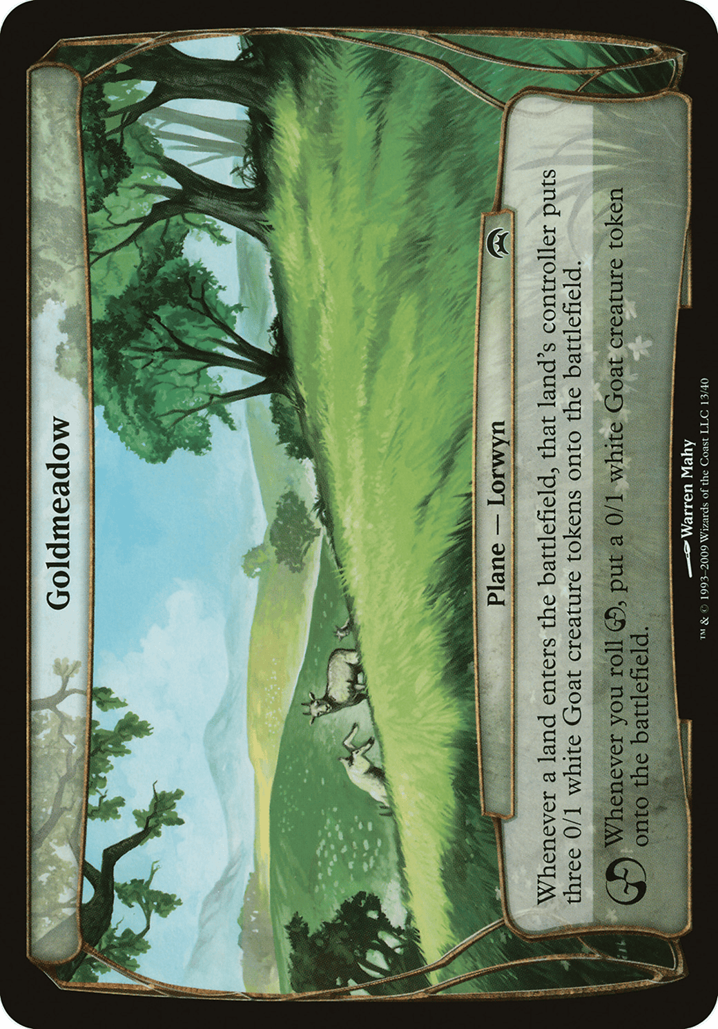 Whenever a land enters, that land’s controller creates three 0/1 white Goat creature tokens. Whenever chaos ensues, create a 0/1 white Goat creature token.