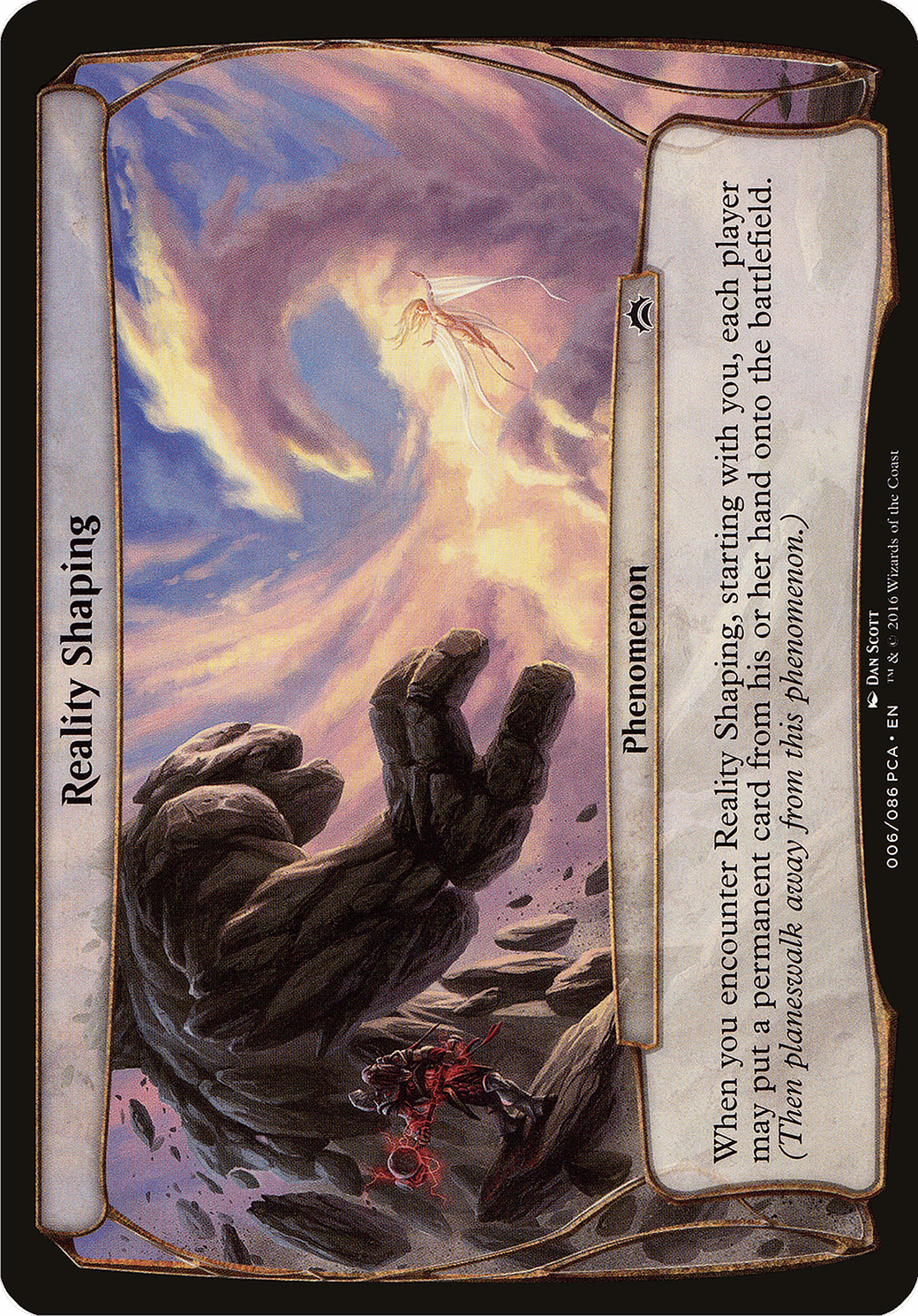 When you encounter Reality Shaping, starting with you, each player may put a permanent card from their hand onto the battlefield. (Then planeswalk away from this phenomenon.)