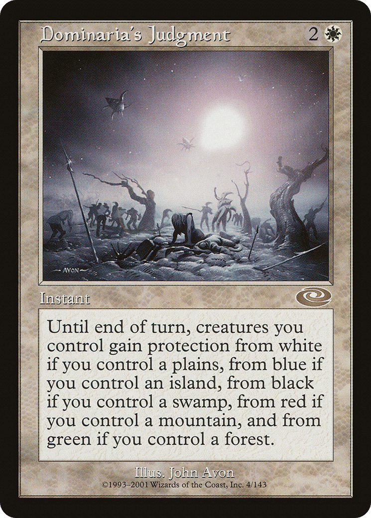 Until end of turn, creatures you control gain protection from white if you control a Plains, from blue if you control an Island, from black if you control a Swamp, from red if you control a Mountain, and from green if you control a Forest.