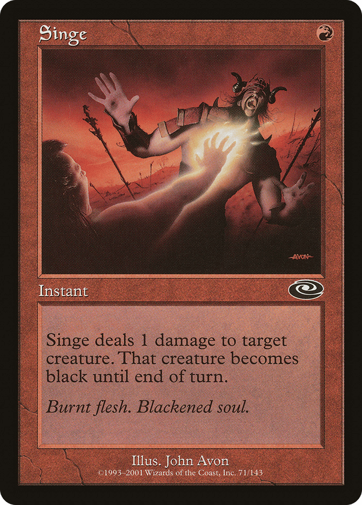 Singe deals 1 damage to target creature. That creature becomes black until end of turn.
