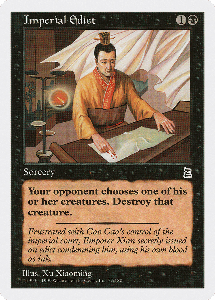 Frustrated with Cao Cao’s control of the imperial court, Emperor Xian secretly issued an edict condemning him, using his own blood as ink.